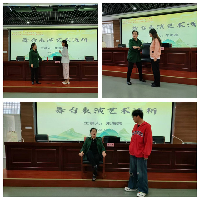 朱海燕院長(zhǎng)藝德高尚、藝術(shù)精湛,曾獲中國(guó)話劇最高獎(jiǎng)——“演員金獅獎(jiǎng)”“導(dǎo)演金獅獎(jiǎng)”,被安徽省人民政府授予“安徽省先進(jìn)工作者”、安徽省“十佳文藝工作者”等榮譽(yù)稱號(hào)。講座中她以自身經(jīng)歷為切入點(diǎn),結(jié)合曾出演的作品,用精彩的語(yǔ)言和生動(dòng)的示范,向同學(xué)們闡釋了話劇表演中如何做好角色處理、情緒掌控和語(yǔ)言的表達(dá)。朱院長(zhǎng)還采用沉浸式體驗(yàn)的方式和同學(xué)們互動(dòng)表演,使同學(xué)們現(xiàn)場(chǎng)體驗(yàn)到話劇舞臺(tái)表演的獨(dú)特魅力。