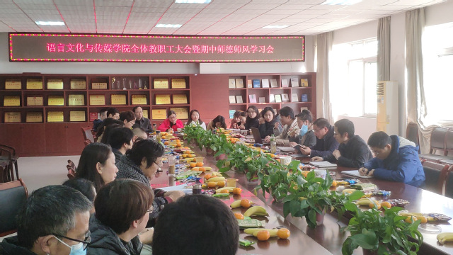 11月14日下午,語言文化與傳媒學院在二樓會議室召開全體教職工大會暨期中師德師風學習會,會議由院長丁增武主持。