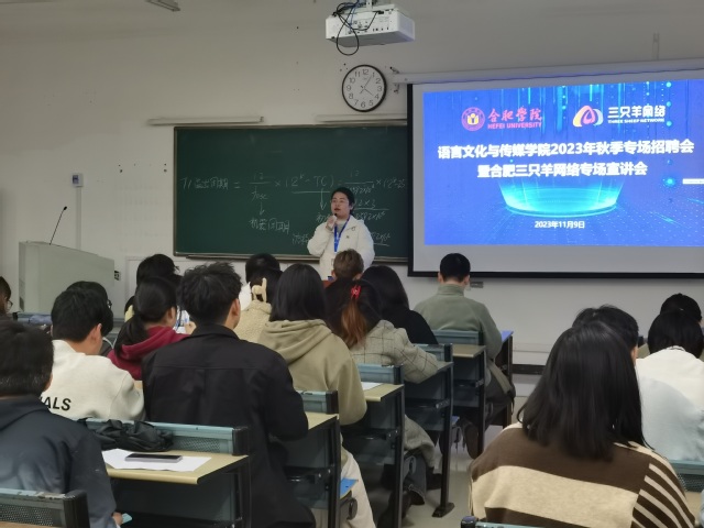 為使學生更加深入了解用人單位,促進校企合作,強化校友聯系,我院還組織了校友企業合肥三只羊網絡在35號樓207教室召開了專場宣講會。會上,招聘工作人員介紹了公司的企業文化、現有產業結構、組織框架、規章制度,并對同學們關注的福利待遇、人力資源政策等方面作了詳細說明。該企業擬招聘100人,宣講會結束后,參會學生就重點關注的崗位條件,晉升發展途徑及薪資待遇等問題開展現場交流,踴躍投遞簡歷。