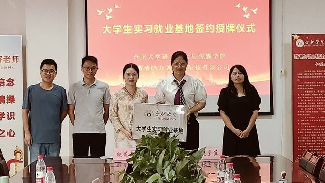 625日,合肥大學語言文化與傳媒學院與安徽清曉方塘教育科技有限公司在一區善思樓C座二樓會議室舉行了大學生實習就業基地簽約授牌儀式。